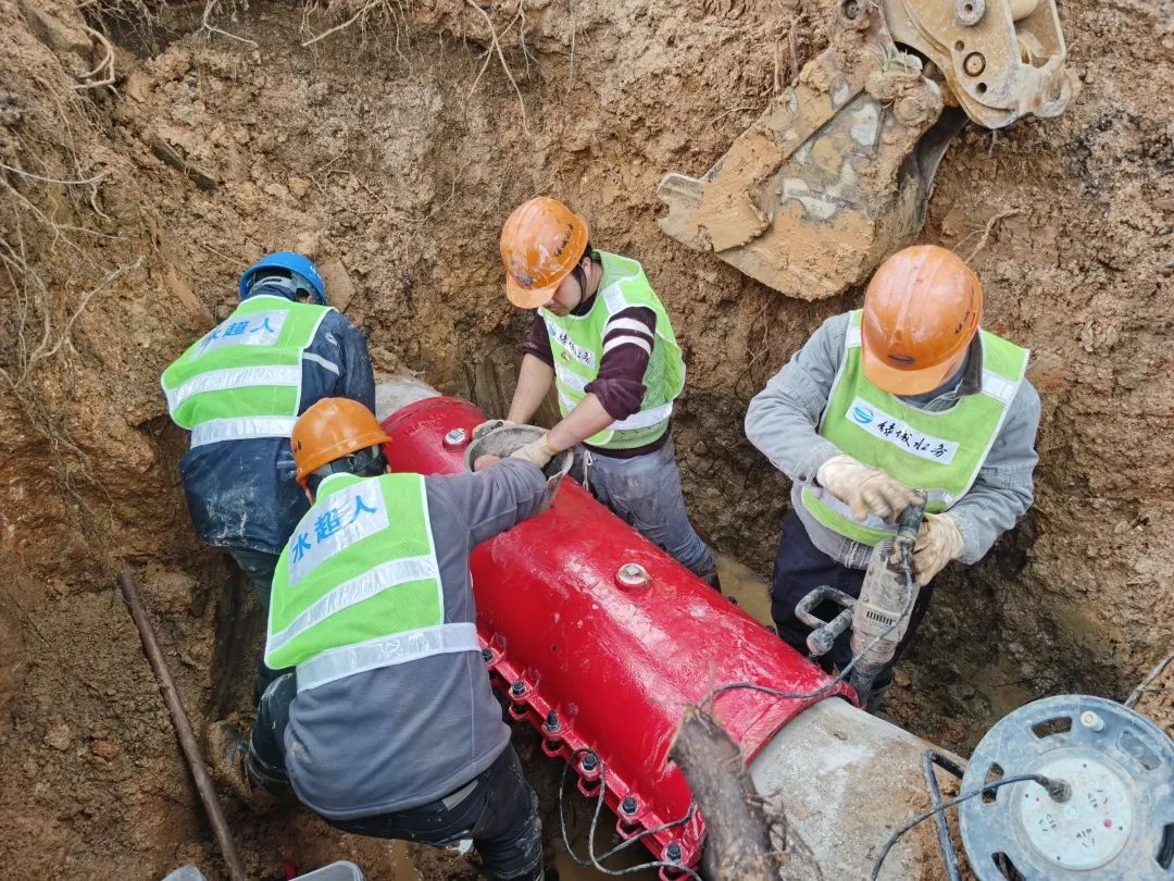 經(jīng)現(xiàn)場勘查,確定是地下一根DN400水泥管突發(fā)爆裂滲水,“水超人”應(yīng)急搶修隊員立即投入“戰(zhàn)斗”。“春節(jié)期間保供水刻不容緩,我們務(wù)必爭分奪秒,盡快恢復(fù)通水,將停水對市民的影響降到最低”,搶修班班長徐振峰一邊指揮搶修隊伍進(jìn)行搶修,一邊緊急安排送水車確保市民應(yīng)急用水。搶修隊員依據(jù)以往豐富的經(jīng)驗,在錯綜復(fù)雜的地下管線中快速找到漏水點(diǎn)后立即開展管道修復(fù)工作。當(dāng)天陰雨綿綿,現(xiàn)場氣溫降到10℃以下,在水中堅持作業(yè)的搶修隊員們?nèi)頋裢,為了搶時間趕進(jìn)度,隊員們冒著瑟瑟寒風(fēng),在冰冷的環(huán)境下輪流上陣,從趕赴現(xiàn)場處置到恢復(fù)供水只用了5小時,高質(zhì)高效完成了沙井大道DN400水泥管的搶修任務(wù)。今年春節(jié)期間南寧遭遇的低溫寒潮天氣給管網(wǎng)管理處帶來了不小挑戰(zhàn),據(jù)統(tǒng)計,春節(jié)期間公司共出動搶修人員1934人次、搶修車輛312車次,送水車31車次,全力為城市供水命脈暢通保駕護(hù)航。