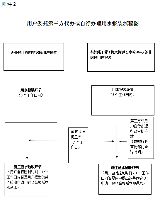 ②用戶委托第三方或自行辦理的,時限由用戶控制,綠城水務(wù)在1個工作日內(nèi)完成設(shè)計施工圖審核,1個工作日內(nèi)答復(fù)用戶提出的共同驗收申請,驗收合格后立即通水。