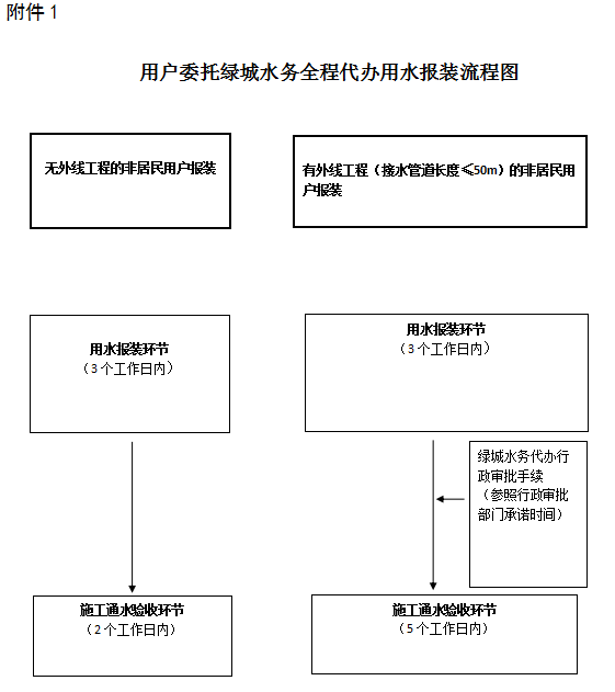 ①委托綠城水務(wù)全程代辦的,無外線工程施工通水驗收時間不超過2個工作日,有外線工程(外線工程長度≤50m)施工通水驗收時間不超過5個工作日,不包含辦理行政審批手續(xù)時間。