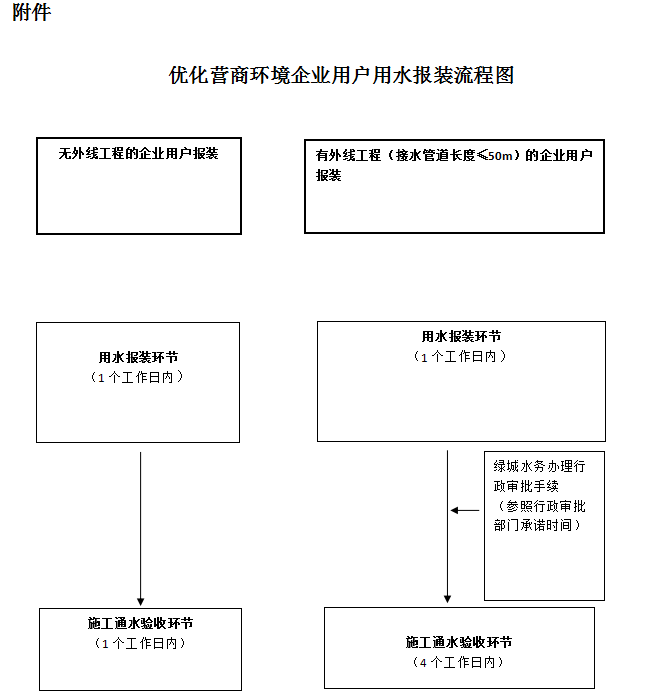 2.施工通水驗收環節:無外線工程施工通水驗收時間不超過1個工作日,有外線工程(外線工程長度≤50m)施工通水驗收時間不超過4個工作日,不包含辦理行政審批手續時間。
