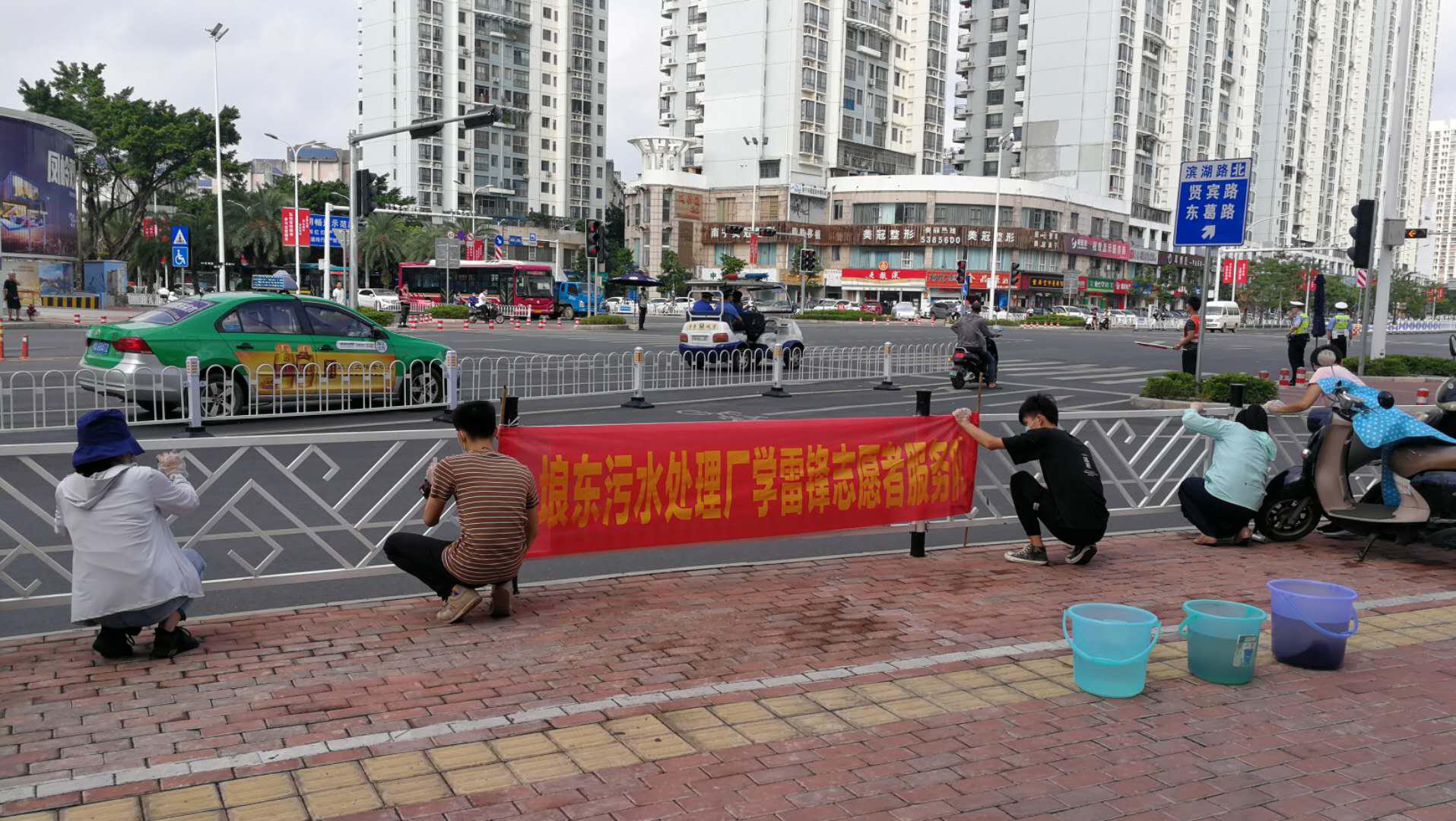埌東污水處理廠的志愿者們拿起抹布、提著水桶等清潔工具,來(lái)到青秀區(qū)清洗道路圍欄。他們兵分兩路,一組負(fù)責(zé)維護(hù)交通秩序,保障志愿者安全,另外一組負(fù)責(zé)擦拭,大家干得熱火朝天,在他們的努力下,整條街道的圍欄煥然一新。